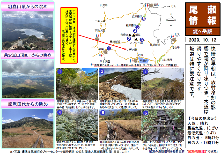 快晴の早朝は、放射冷却の影響で霜が降り凍りつき、木道は滑りやすくなります。