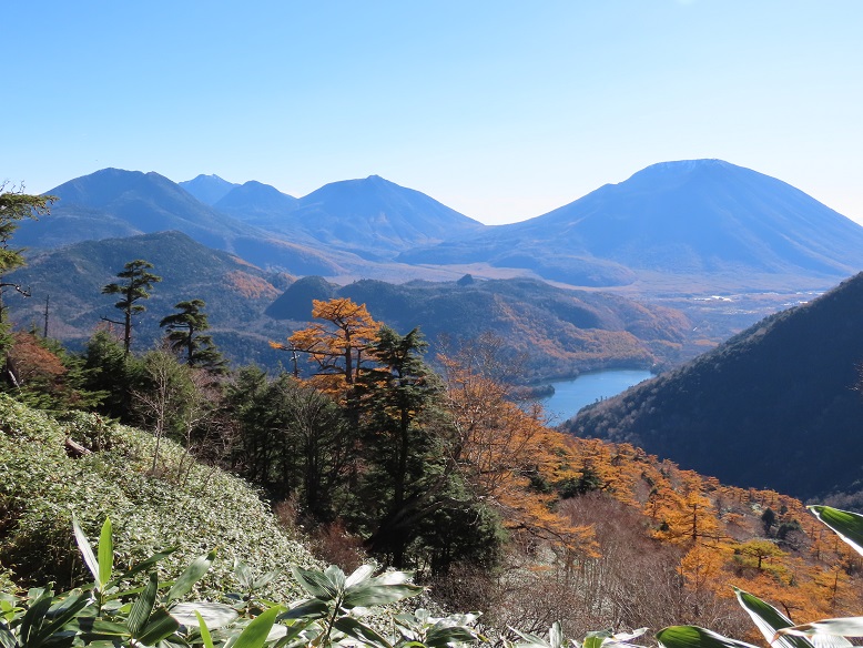 【五色山前白根山間の展望(左:日光白根山 中:五色沼 右奥:尾瀬至仏山)】