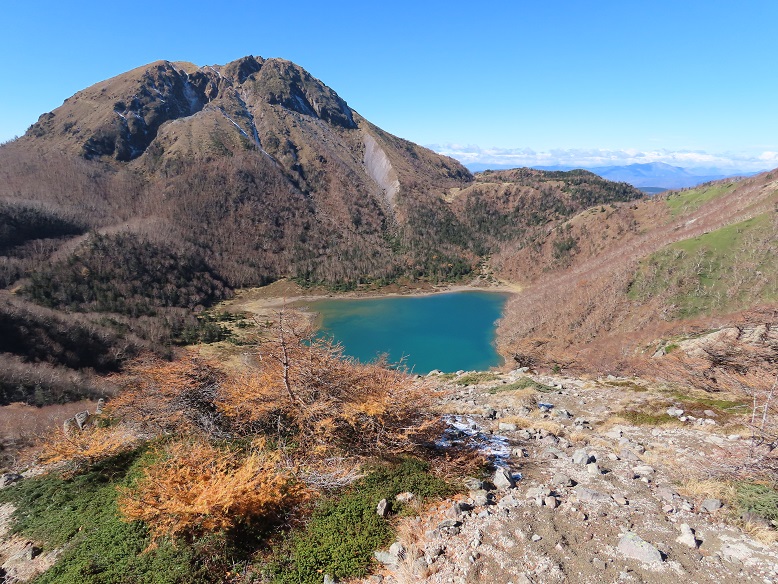 【五色山前白根山間の展望(左:日光白根山 中:五色沼 右奥:尾瀬至仏山)】