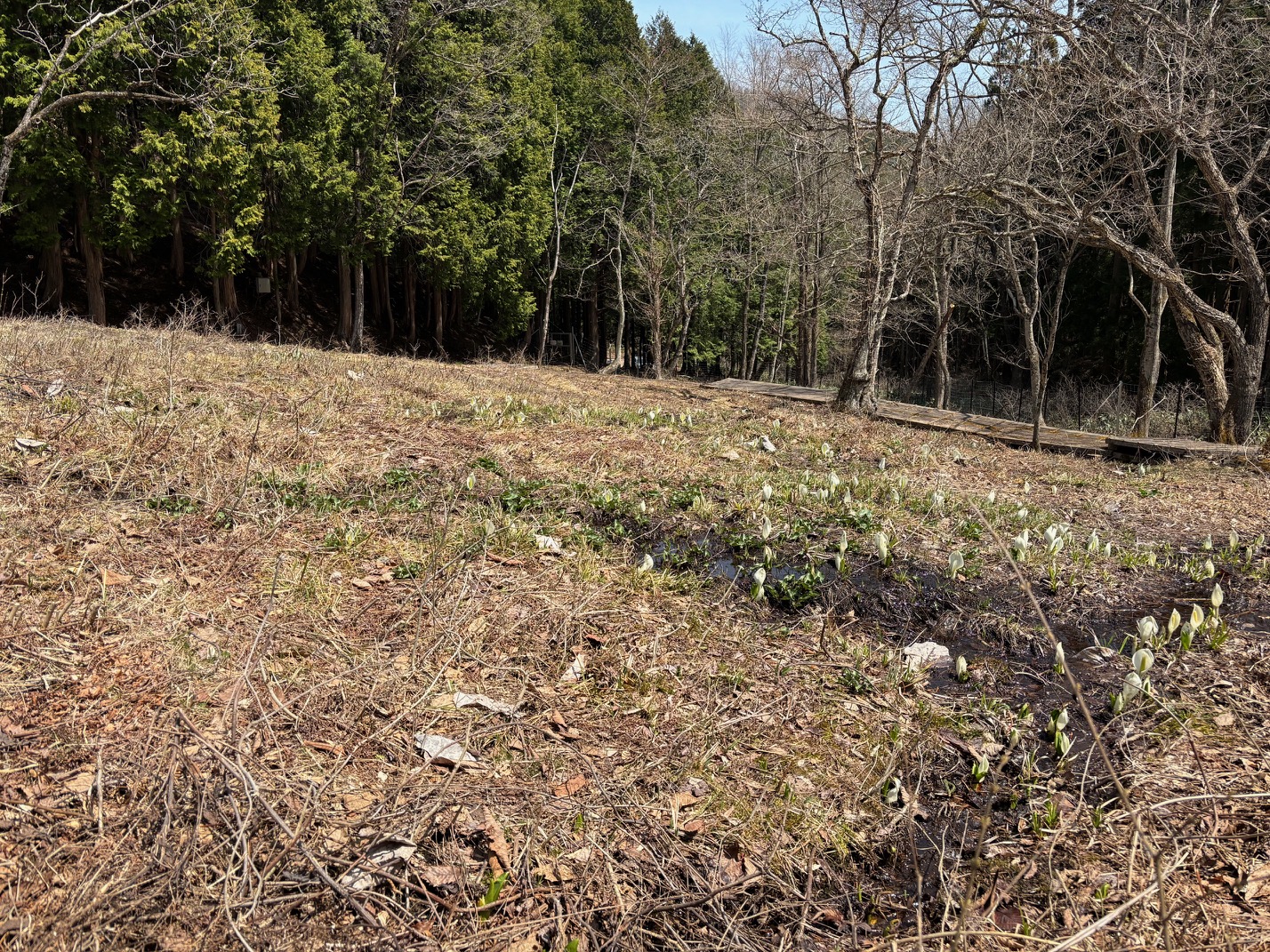 まだ顔を出したばかりのミズバショウが1株見られました。ザゼンソウも顔を出していました。