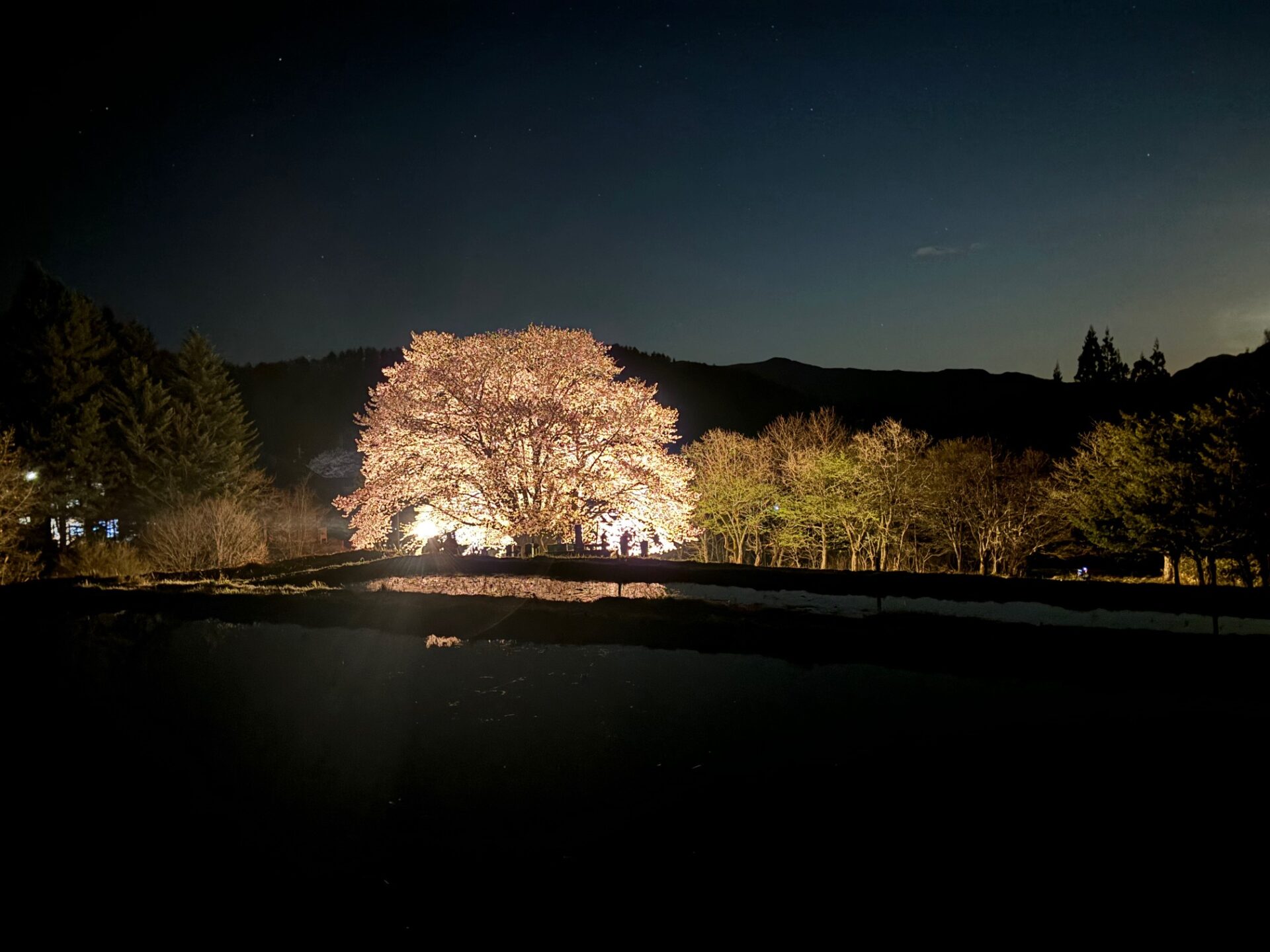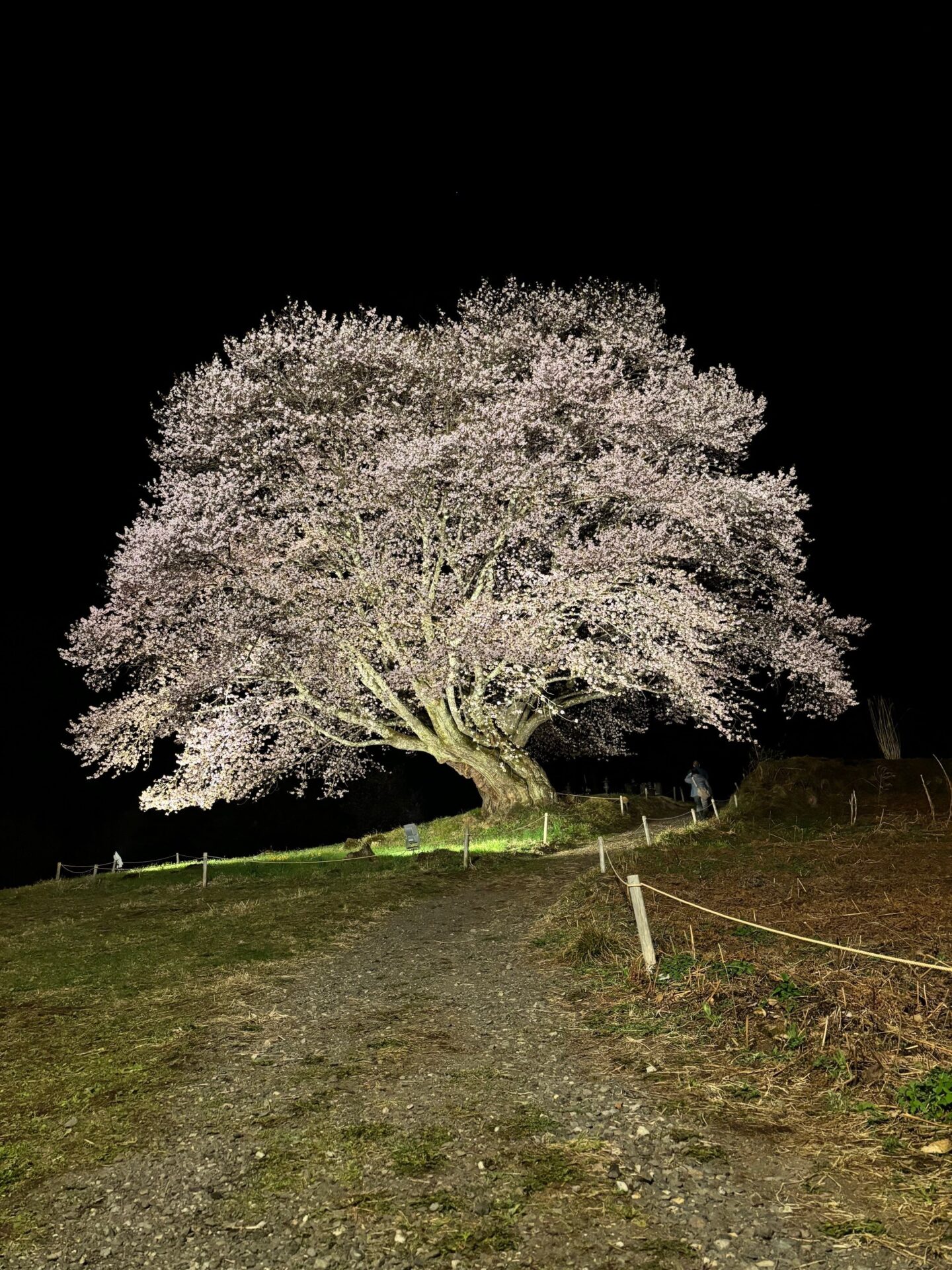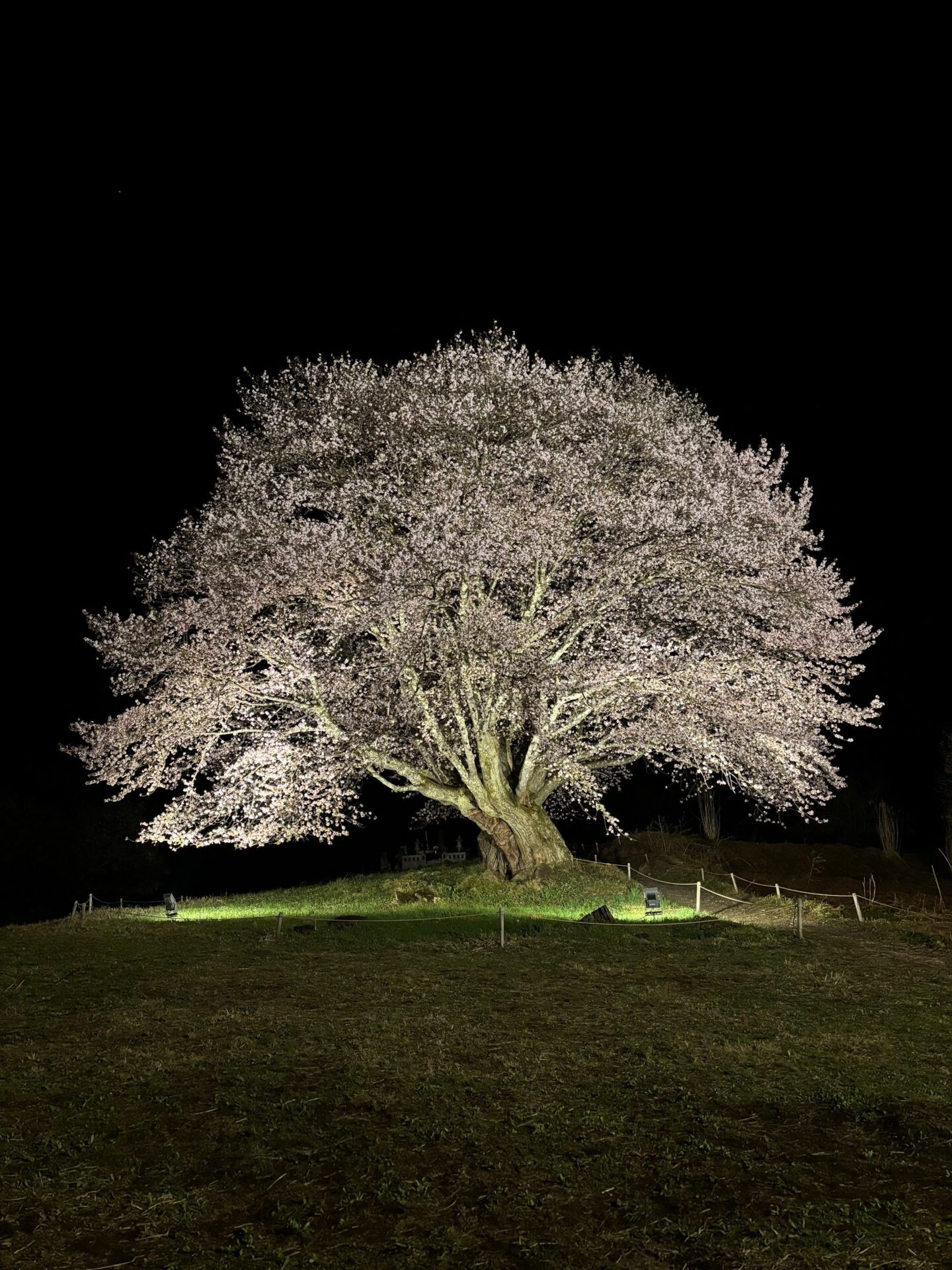 夜のライトアップでは、夜空に輝く星と、天王桜がライトアップされ、より一層の迫力に昼間とはまた違った美しさがあります。