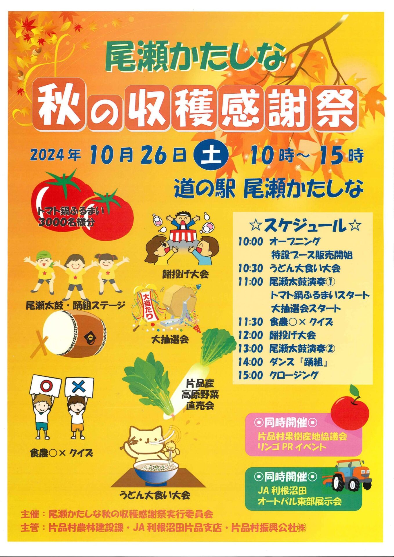 2024年10月26日(土)道の駅尾瀬かたしなにて「尾瀬かたしな秋の収穫感謝祭」が開催されます。