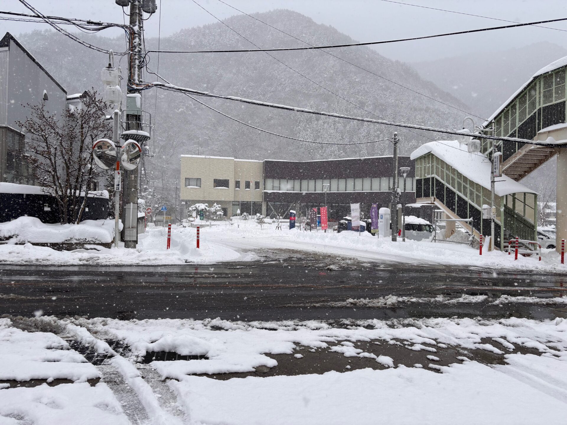 除雪作業はされており、片品村役場前の国道は融雪道路となっているため融けていますが、道路には雪がありますので、片品村へお越しの際には安全運転にてお越し下さい。