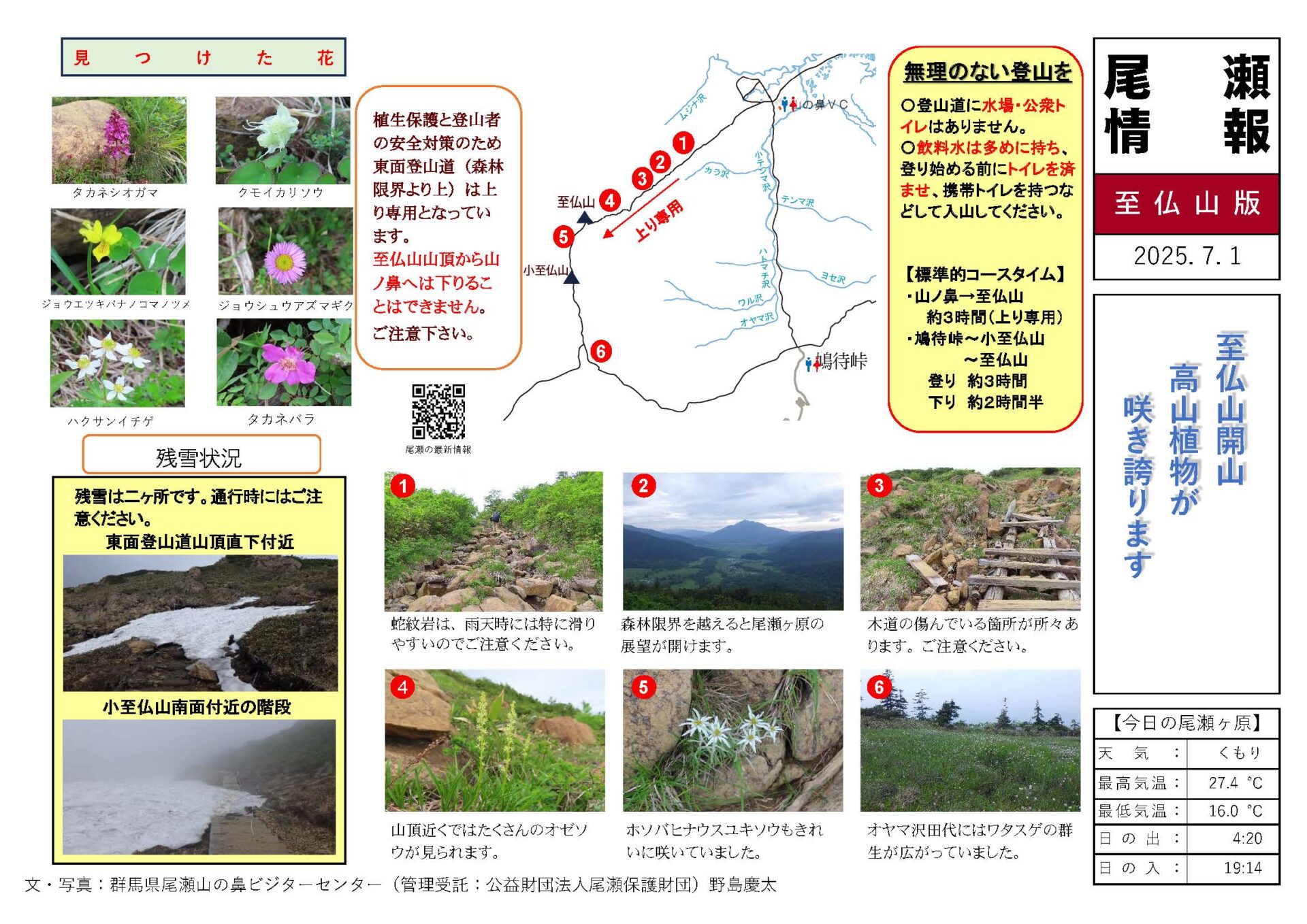 植生保護と登山者の安全対策のため東面登山道(森林限界より上)は上り専用となっています。至仏山山頂から山ノ鼻へは下りることはできません。ご注意下さい。