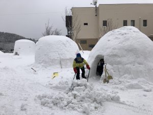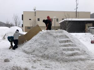 現在3つのでっかまが完成し、かまくらのほか、大きな『雪山滑り台』を作成中です!