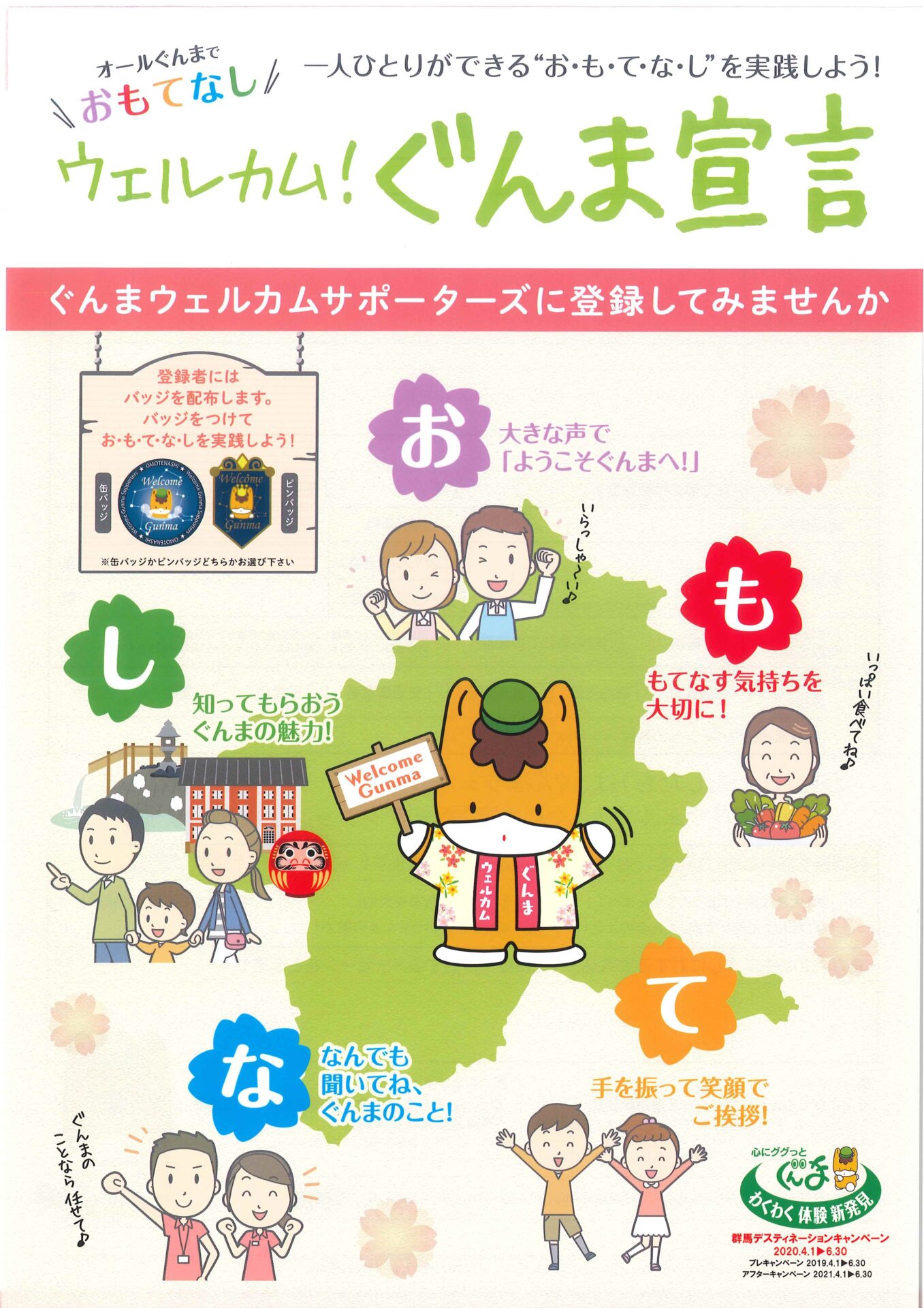 『ぐんまウェルカムサポーターズ』への登録条件は、『ウェルカム!ぐんま宣言』で示す【お・も・て・な・し】のアクションのうち1つ以上の実行を宣言していただくことです。