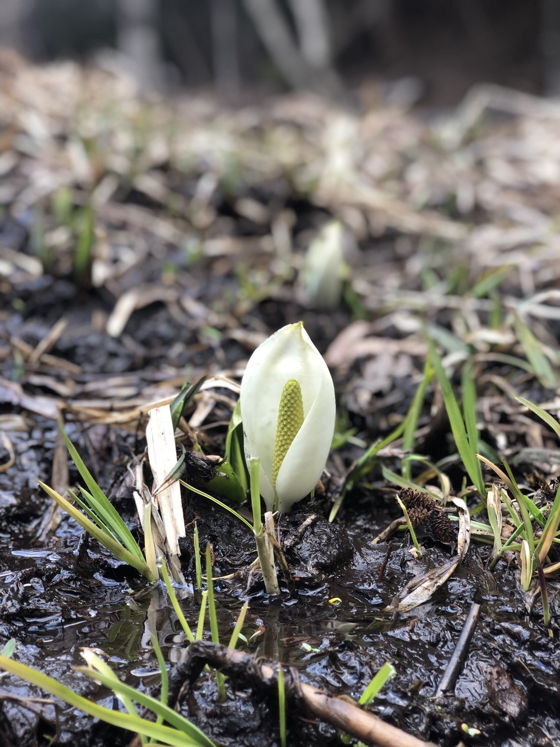 可憐な姿の小さいミズバショウがポツポツ咲いてはいますが、全体の1分咲きといったところかと思います。