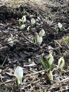 越本水芭蕉の森では、ここ数日の暖かさで雪も解け、日のあたりの良い一部分では、ミズバショウが少しずつ顔を出して始めていました。