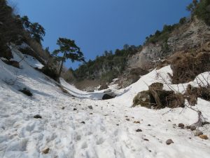 上部で沢を替えるために小尾根を越えますので要注意です。