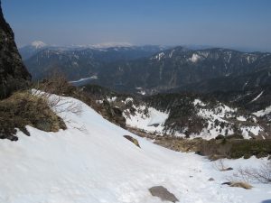 【山頂北面直下急斜面の残雪、弥陀ヶ池と菅沼】