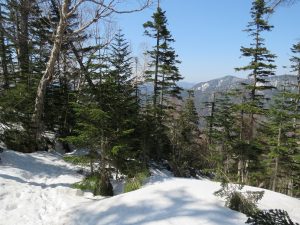 弥陀ヶ池や五色沼は全面凍結ですが緩み始めていて、山頂直下急斜面、特に東面上部残雪の横断痕が不明瞭です。
