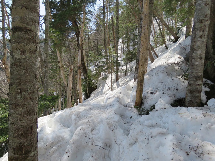 【山頂東面急斜面の消えたトラバース痕】