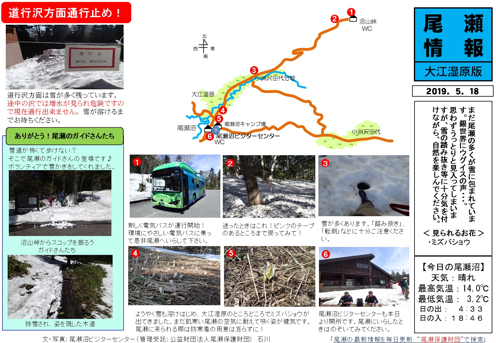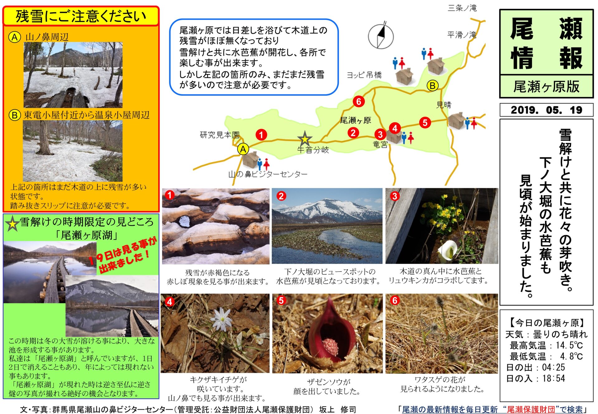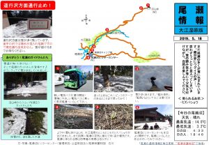 尾瀬ヶ原では日差しを浴びて木道上の残雪がほぼ無くなっており、雪解けと共に水芭蕉が開花し、各所で楽しむ事が出来ます。しかし左記の箇所のみ、まだまだ残雪が多いので注意が必要です。
