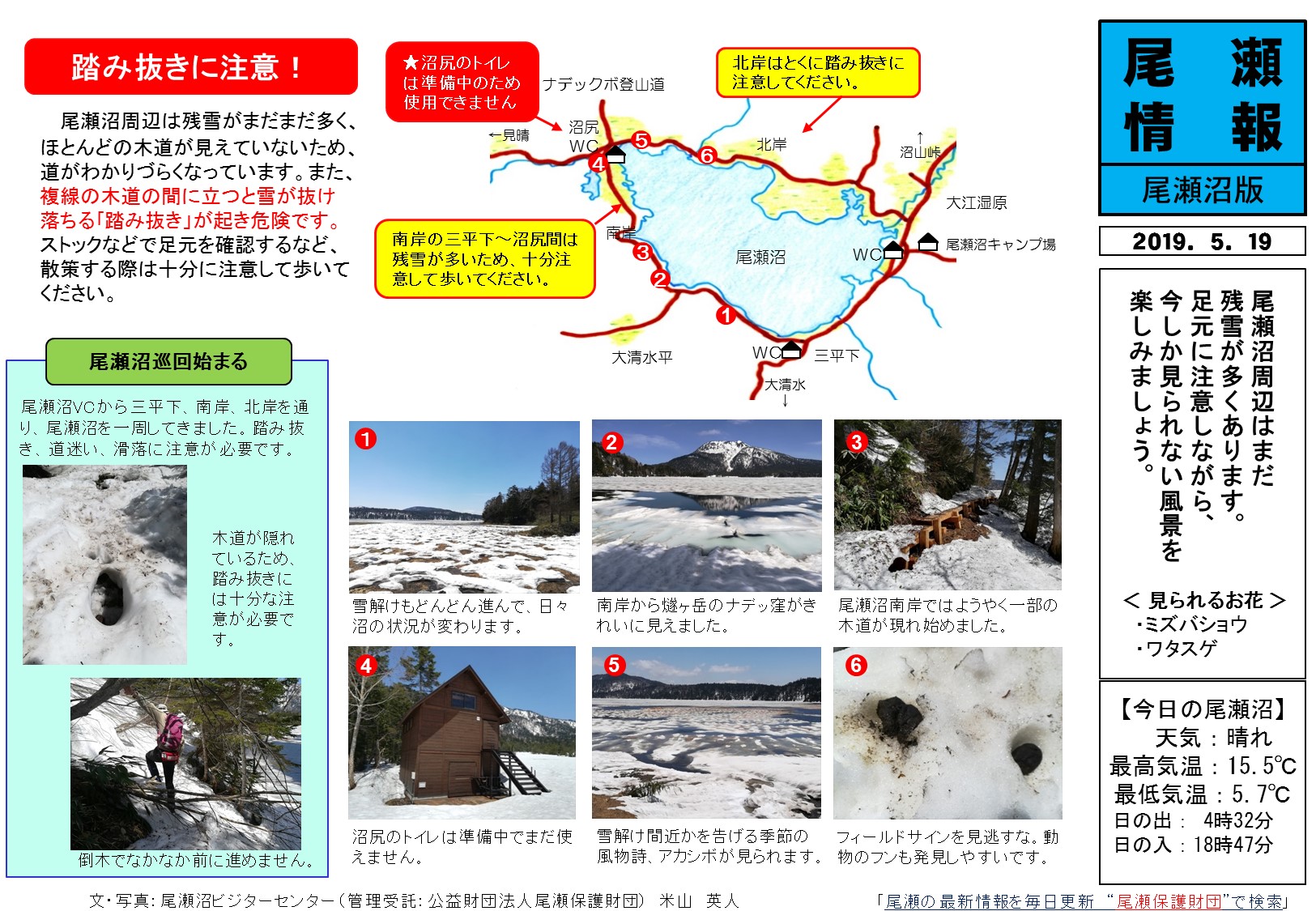 尾瀬沼周辺は残雪がまだまだ多く、ほとんどの木道が見えていないため、道がわかりづらくなっています。また、複線の木道の間に立つと雪が抜け落ちる「踏み抜き」が起き危険です。ストックなどで足元を確認するなど、散策する際は十分に注意して、踏み抜きに注意してください!