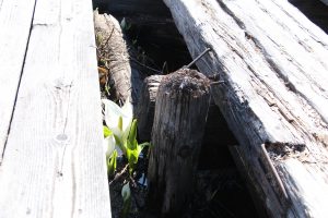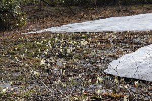 山ノ鼻を過ぎると木道脇にはミズバショウや、リュウキンカが顔を出しています。