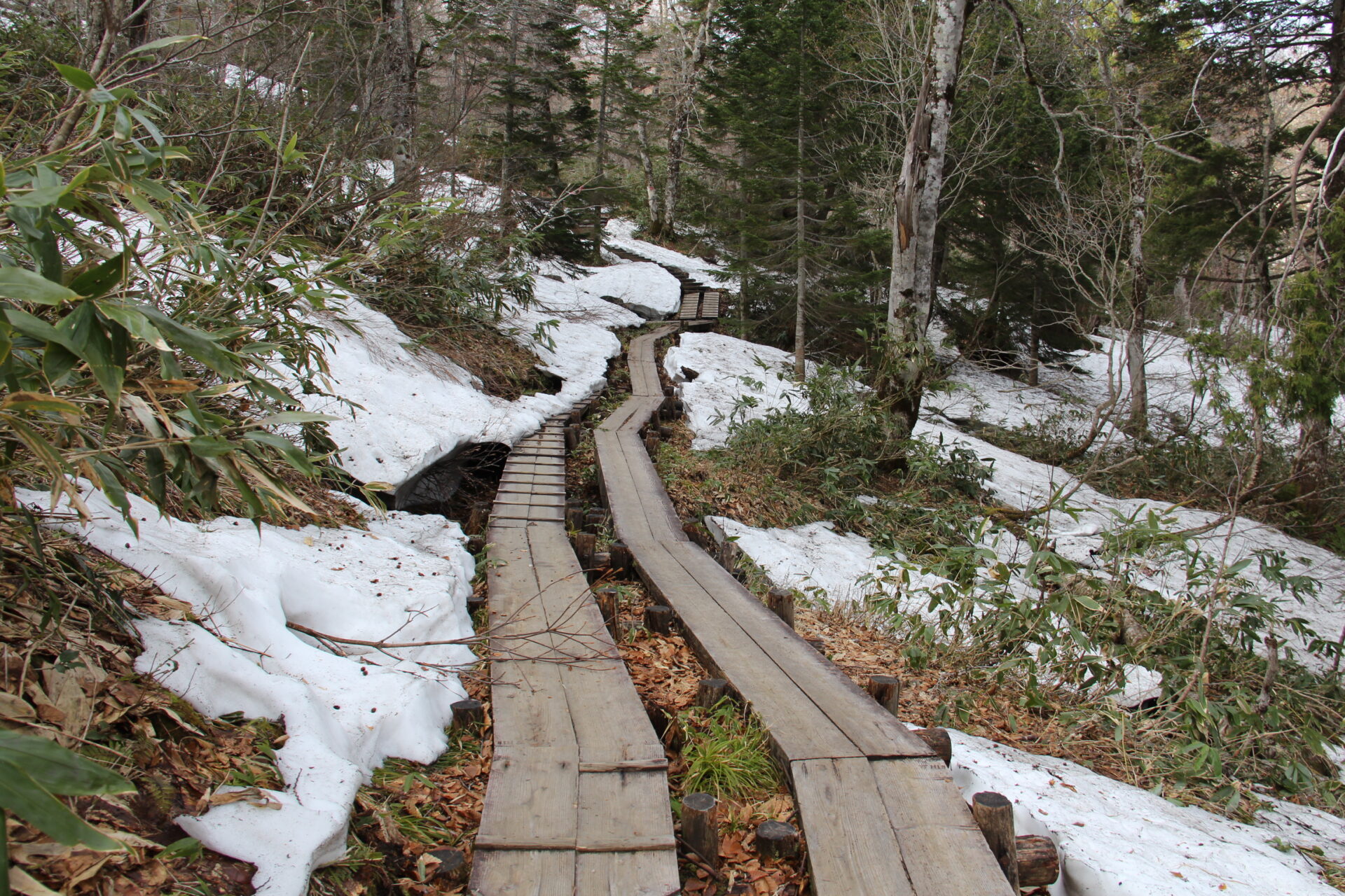 鳩待峠から山ノ鼻間、ほぼ木道が出てきましたが、残雪のある箇所もありますので、踏み抜きに注意してください。