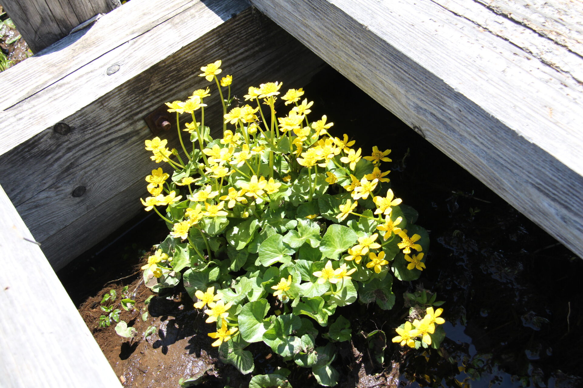山ノ鼻を過ぎると木道脇にはミズバショウや、リュウキンカが顔を出しています。