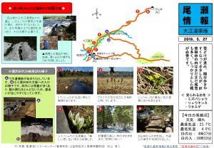 尾瀬沼周辺は残雪がだいぶ消えてきましが、南岸の木道の多くは北斜面に敷設されており、残雪により木道が隠れている場所では踏み跡も不明瞭で、ルートがわかり難くなっています。また、雪に隠れた木道の間に立つと雪が抜け落ちる『踏み抜き』が起き危険ですので十分注意してください。