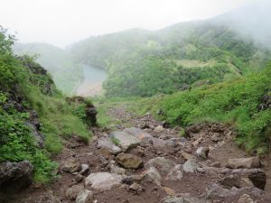 【山頂直下急斜面と霧中の弥陀ヶ池】