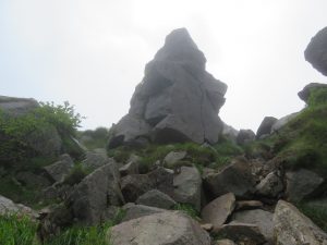 霧と雲が流れ青空も垣間見える微妙な日、小学生団体以外は数えるほどで、周囲が見えない山頂では雨粒も落ちて来て、思わず雨具を羽織る登山者もいらっしゃいました。