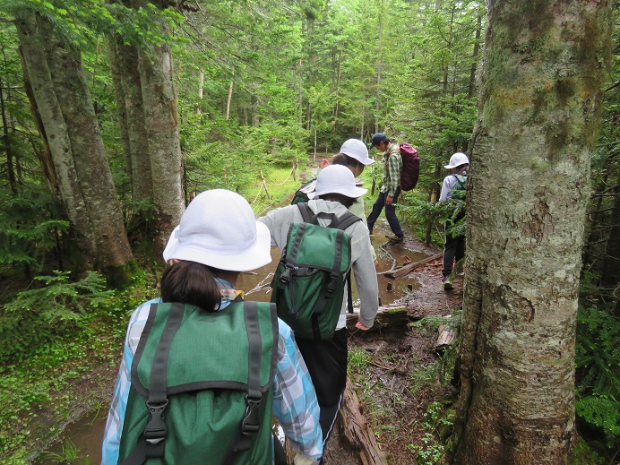 【針葉樹林下の水溜まりや滑りやすい急坂】