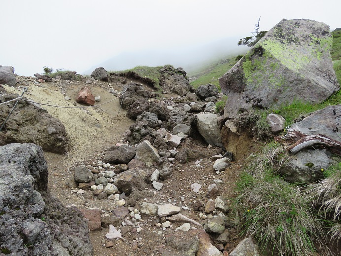 霧と雲が流れ青空も垣間見える微妙な日、小学生団体以外は数えるほどで、周囲が見えない山頂では雨粒も落ちて来て、思わず雨具を羽織る登山者もいらっしゃいました。