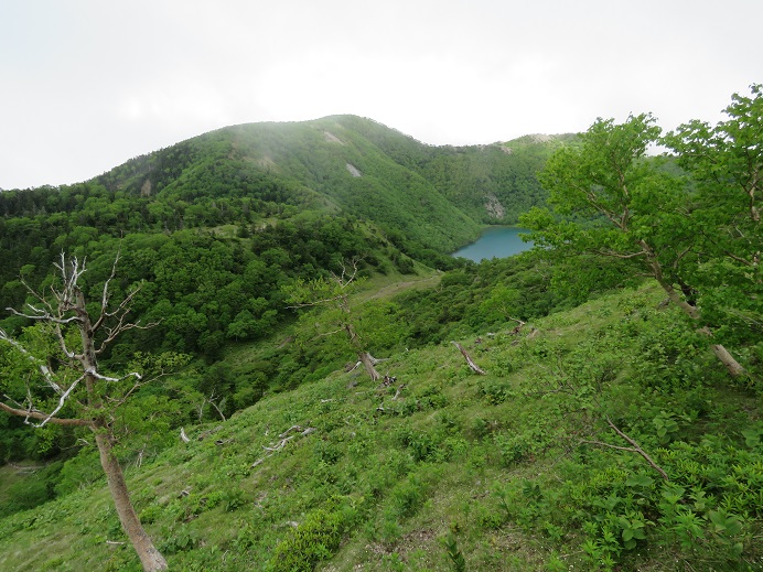 【山頂直下急斜面と霧中の弥陀ヶ池】