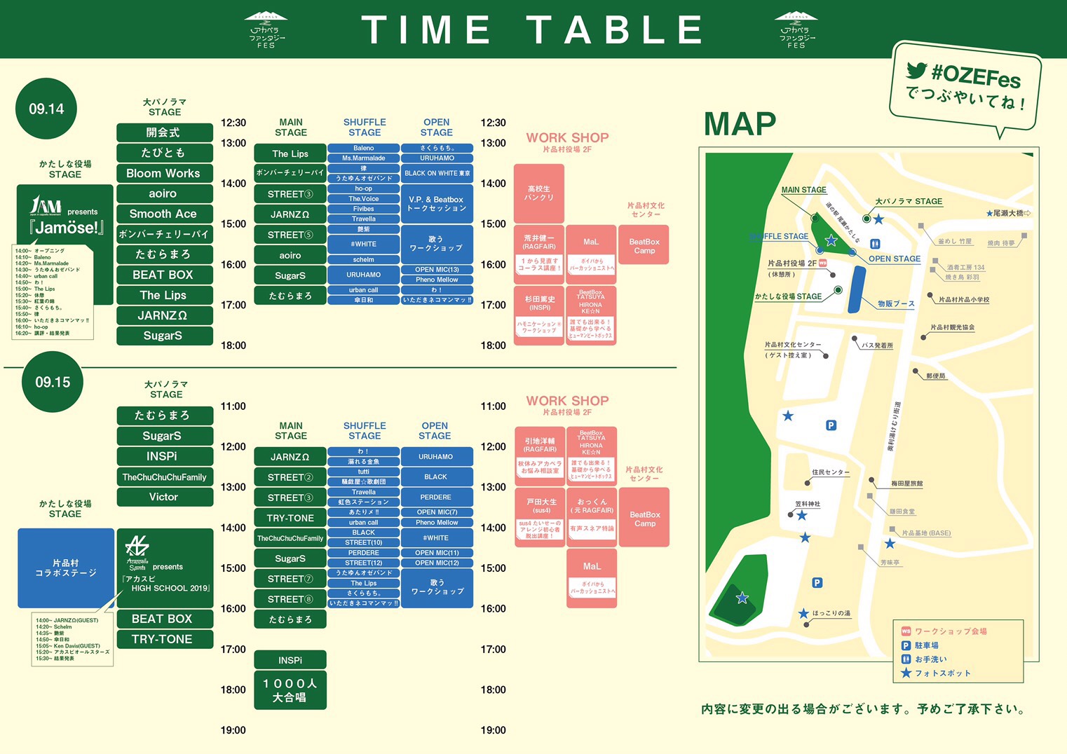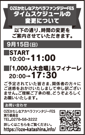 昨日、9月12日(木)新聞折込させていただきました『OZEかたしなアカペラファンタジーFES』のチラシについて、Time Tableの時間が変更となりましたので、お知らせさせていただきます📢