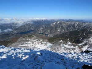 【山頂西斜面と右奥に男体山、中禅寺湖】