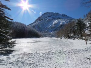 弥陀ヶ池や五色沼は凍結していますが、乗ると軋みます💦