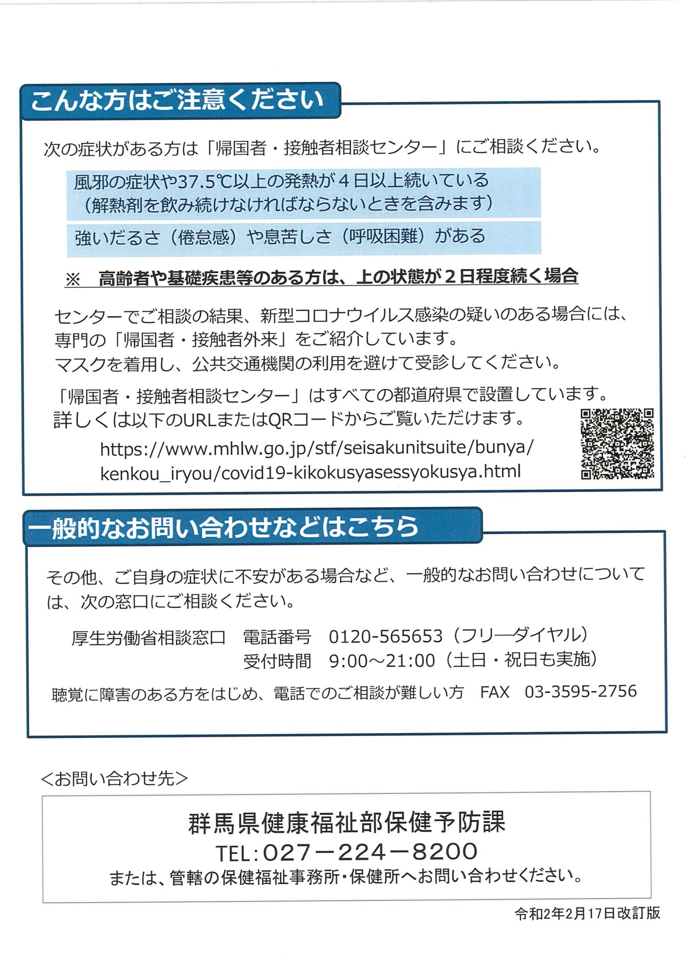 ●群馬県保健予防課 「帰国者・接触者相談支援センター」