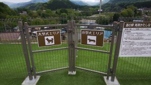 駐車場から展望テラスを経由してドッグランまでの道のりは、犬の足跡のペイントで誘導するユニークな案内方法で、ドッグランそのものは尾瀬大橋や大滝調整池などをはじめ、遠くの山々まで見渡せる気持ち良い眺めの中で利用でき、大型犬と小型犬が別々に利用できる仕組みになっています。