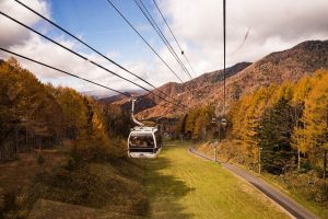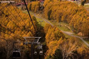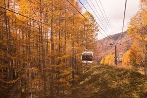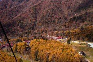 ロープウェイ乗車中は黄金色に輝くカラマツ林を抜けると下界の紅葉を見下ろす事が出来ます。