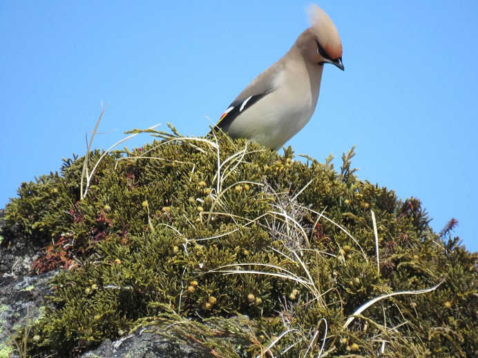 今年も春の使者、キレンジャクがシンパクの実を食べながら盛んに飛び交っています。