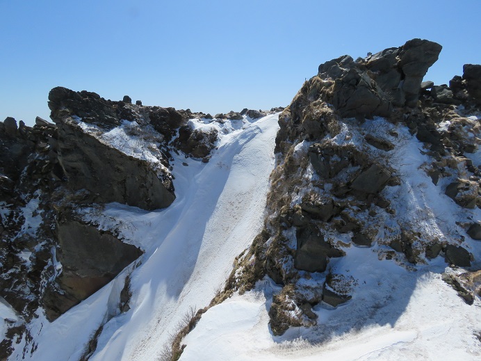 トレースはほぼ、丸沼高原山頂駅から日光白根山山頂間のルートに付いていて、それ以外は登山者判断で、かつ踏み抜き覚悟で歩くことになり、道迷いによる疲労や、凍結急雪面での滑落に注意が必要です。