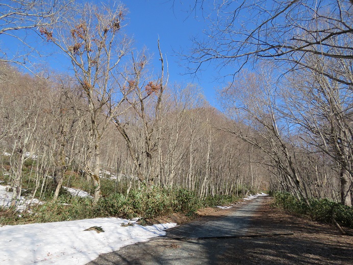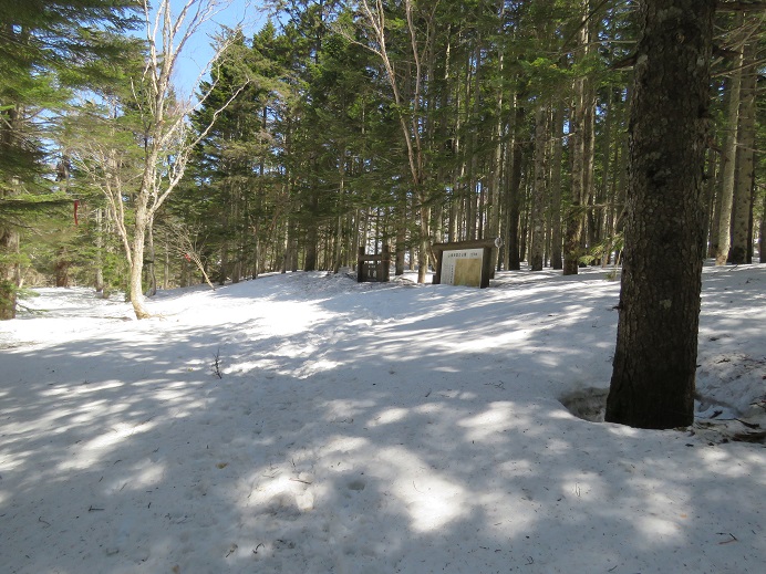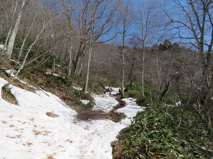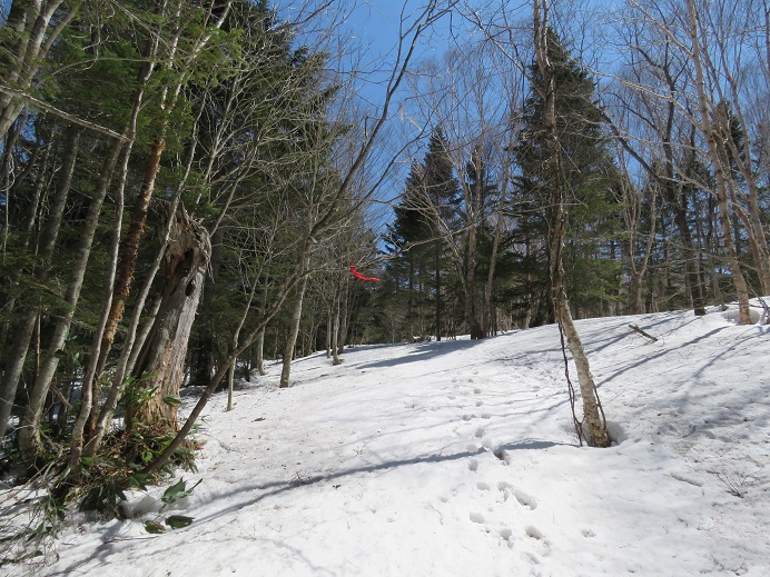 夏道はだいぶ出ていますが、広葉樹林内では踏み抜きと滑落、針葉樹林帯内では特に道迷い注意です。