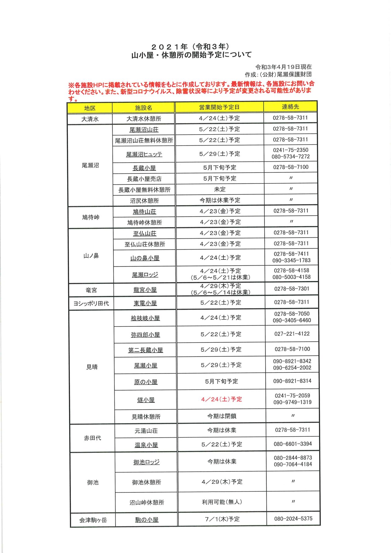 【2021年(令和3年)山小屋・休憩所の開始予定について】
