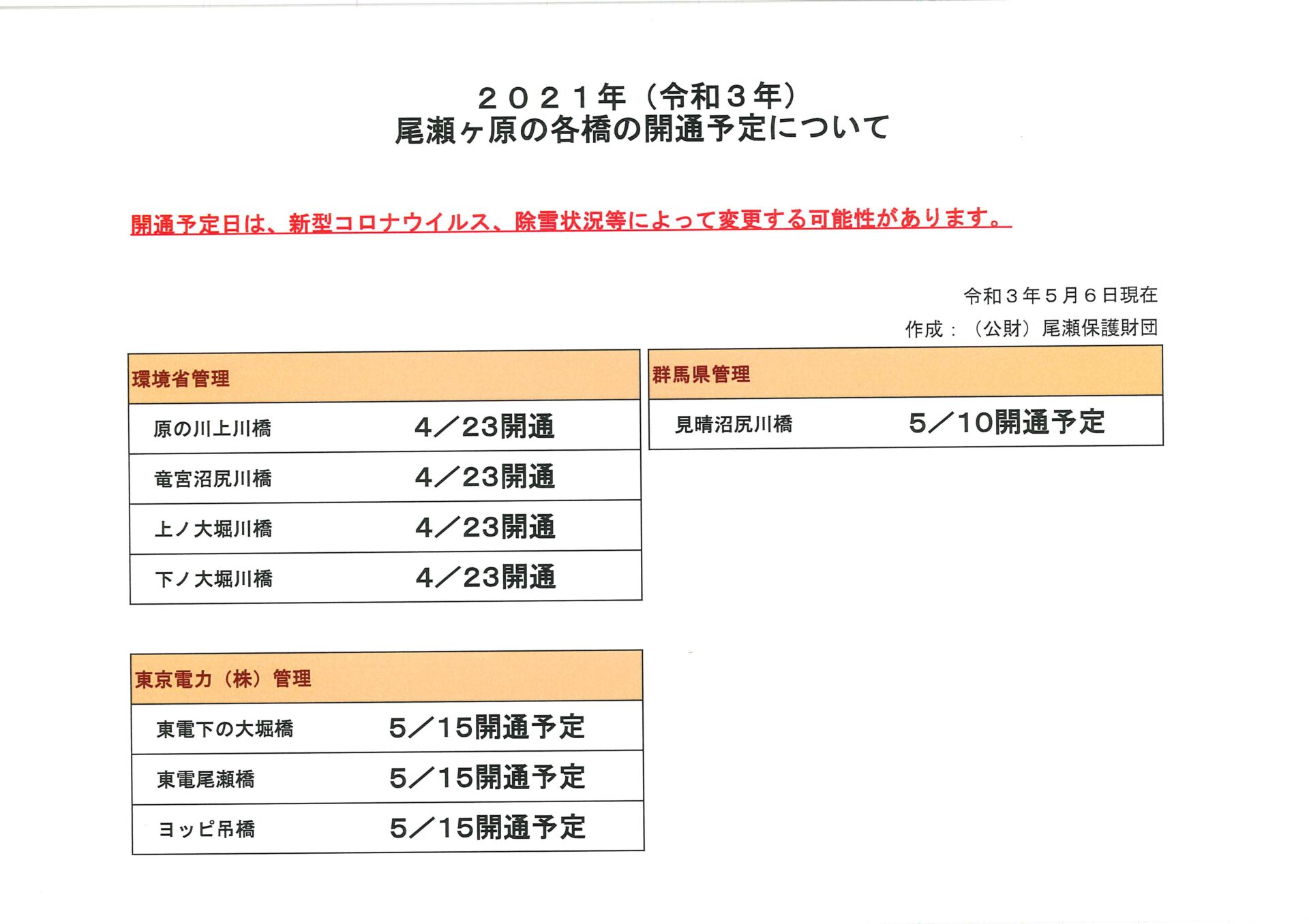 【2021年(令和3年)尾瀬ヶ原の各橋の開通予定について】