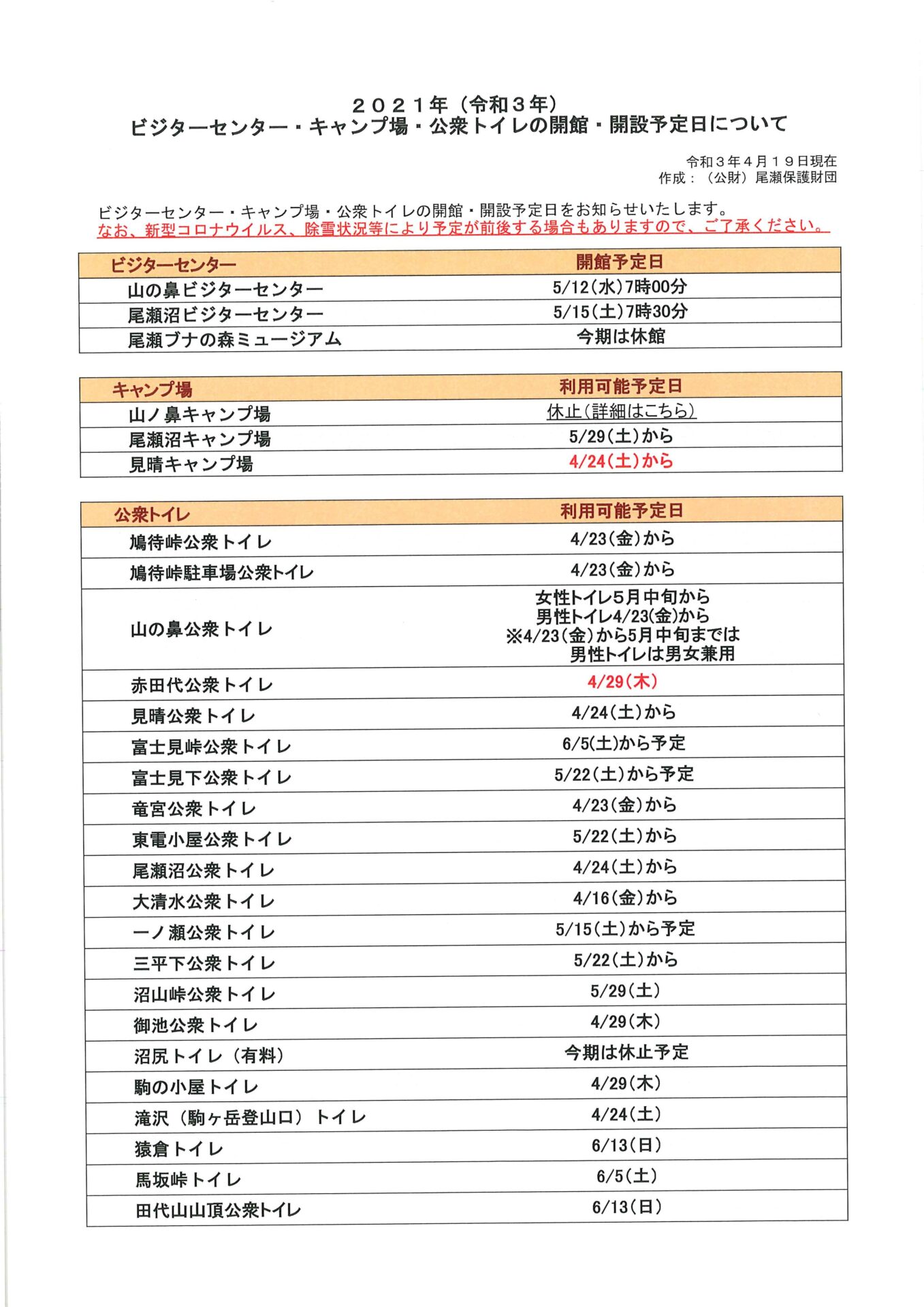 【2021年(令和3年)ビジターセンター・キャンプ場・公衆トイレの開館・開設予定日について】