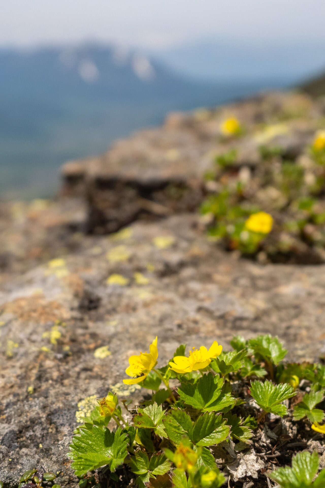 山頂直下の雪田では、たくさんのサンカヨウの花が咲いています。キヌガサソウの開花まであと1週間くらいです。