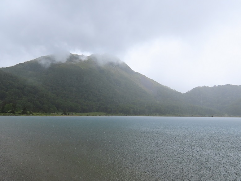 【五色沼湖面に叩きつける激しいスコール】