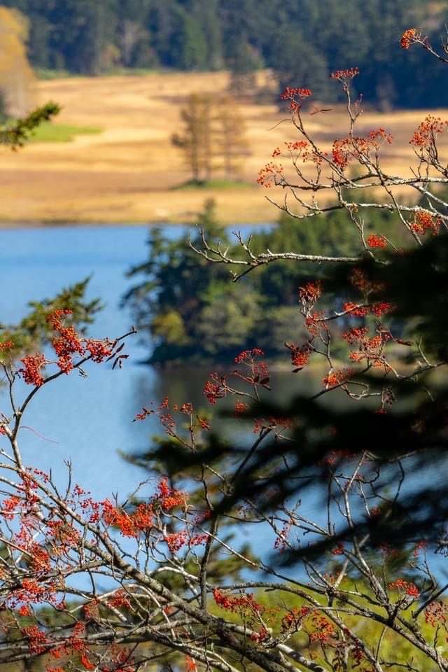 青空とその色を移した湖、その周りを草紅葉の湿原や、朱く鮮やかに紅葉したツツジなどの低木が飾っており、一服の絵のようでした。