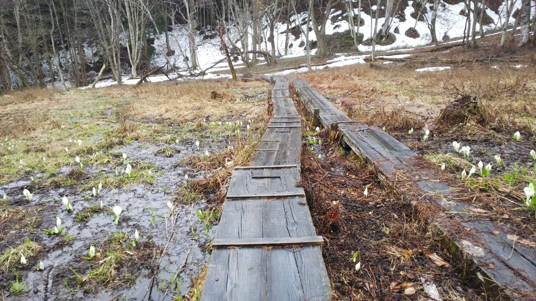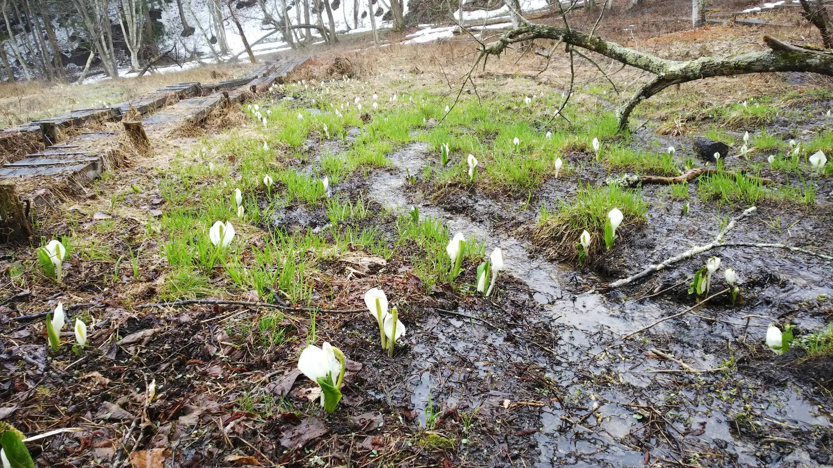 国道沿いにも残雪があり、湿原内もまだ雪に覆われているところもありますが、手前側には小ぶりのカワイイ水芭蕉が顔を出していました。