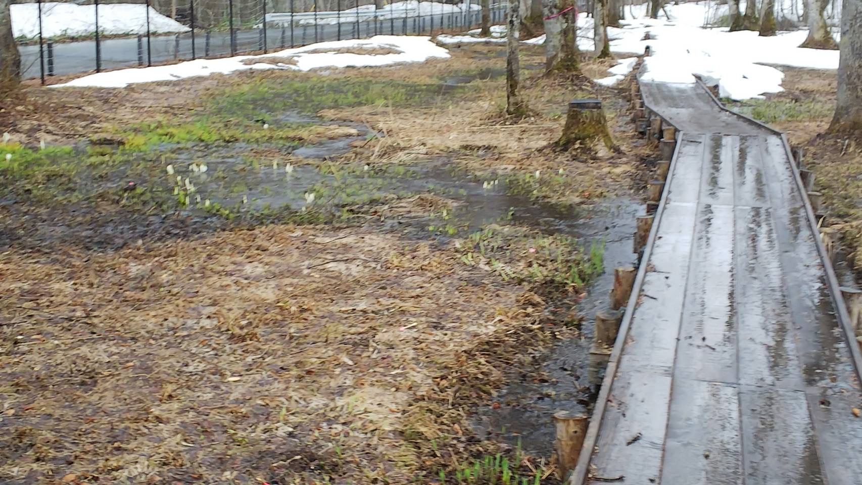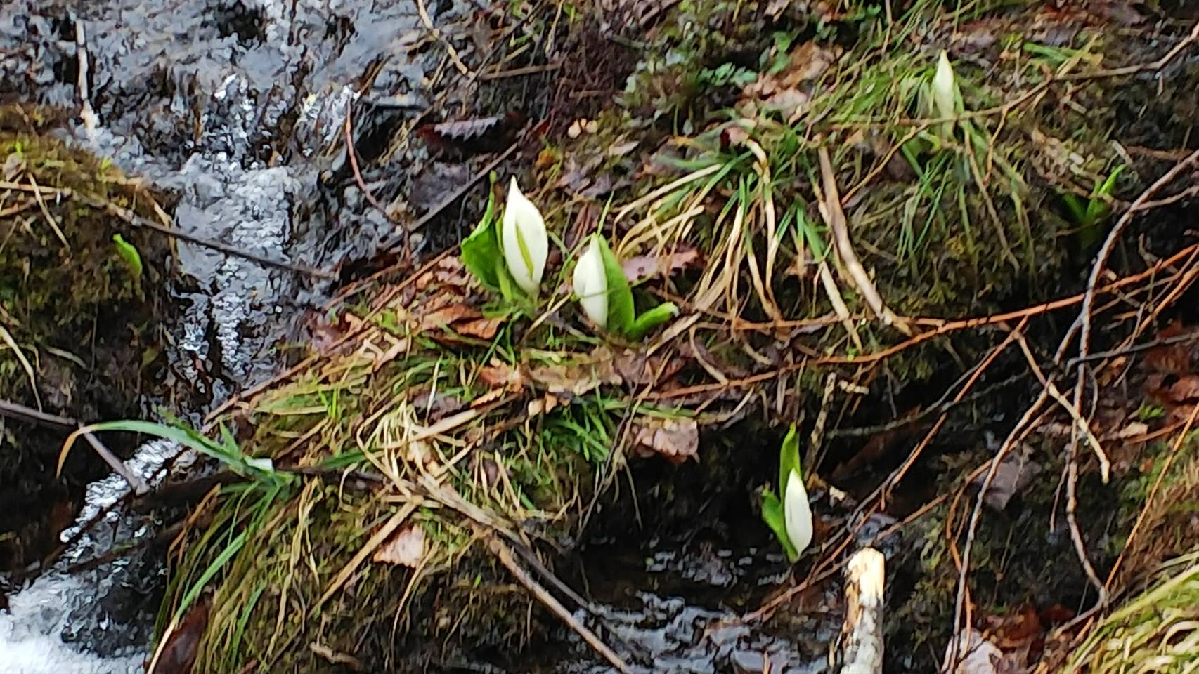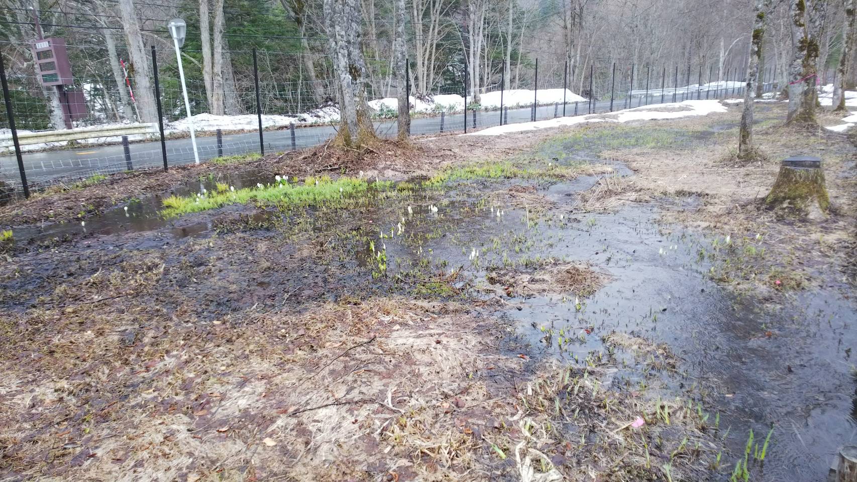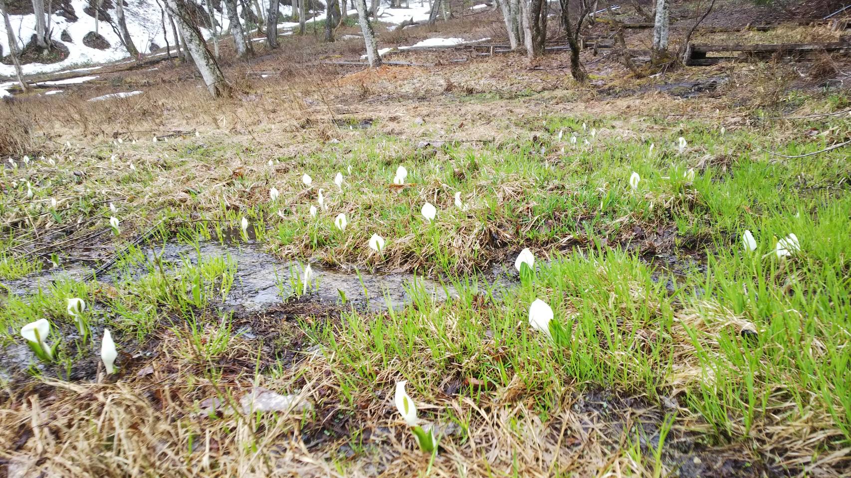 国道沿いにも残雪があり、湿原内もまだ雪に覆われているところもありますが、手前側には小ぶりのカワイイ水芭蕉が顔を出していました。
