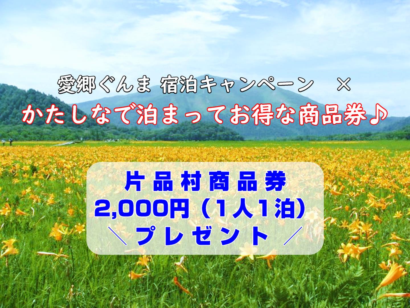 愛郷ぐんまプロジェクト第5弾「宿泊キャンペーン」が延長となり、片品村では、対象期間中に愛郷ぐんまプロジェクト「宿泊キャンペーン」を利用し、村内登録宿泊施設に宿泊(1人1泊あたり税込6,600円以上)した方へ片品村オリジナル特典として『片品村商品券』を進呈します!!
