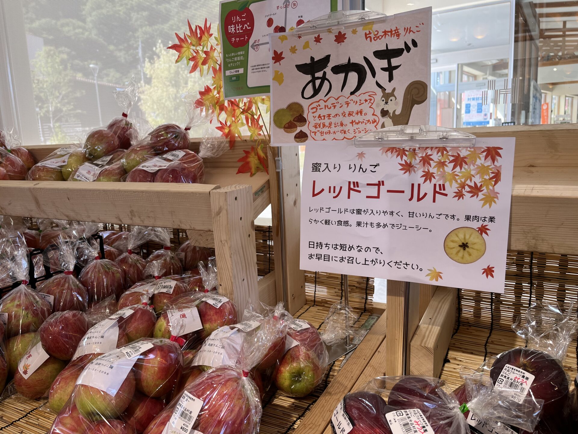 道の駅尾瀬かたしな「農産物かたしなや」では、今が旬の多種多様なリンゴが並んでいます。