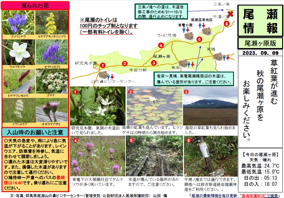 ※三条ノ滝への道は、木道改修工事のため、8/21~10/3の間、通行止めになります。平滑ノ滝までは通行できます。御池へは段吉新道経由燧裏林道をご利用ください。