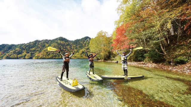 夏 秋全国屈指の透明度を誇る菅沼で、美しい深青色の湖面に浮かぶSUP(スタンダップパドルサーフ)。比較的簡...