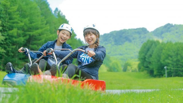 夏丸沼高原の高低差100m、全長800mのダウンヒルを専用カートで楽しむ「リュージュ」。最高速度時速4...