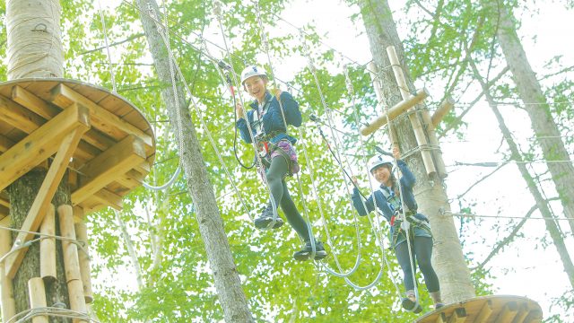 夏森の自然木を結ぶ足場やつり橋などをハーネスを装着して冒険する「ツリーアドベンチャー」。2 コースあり...